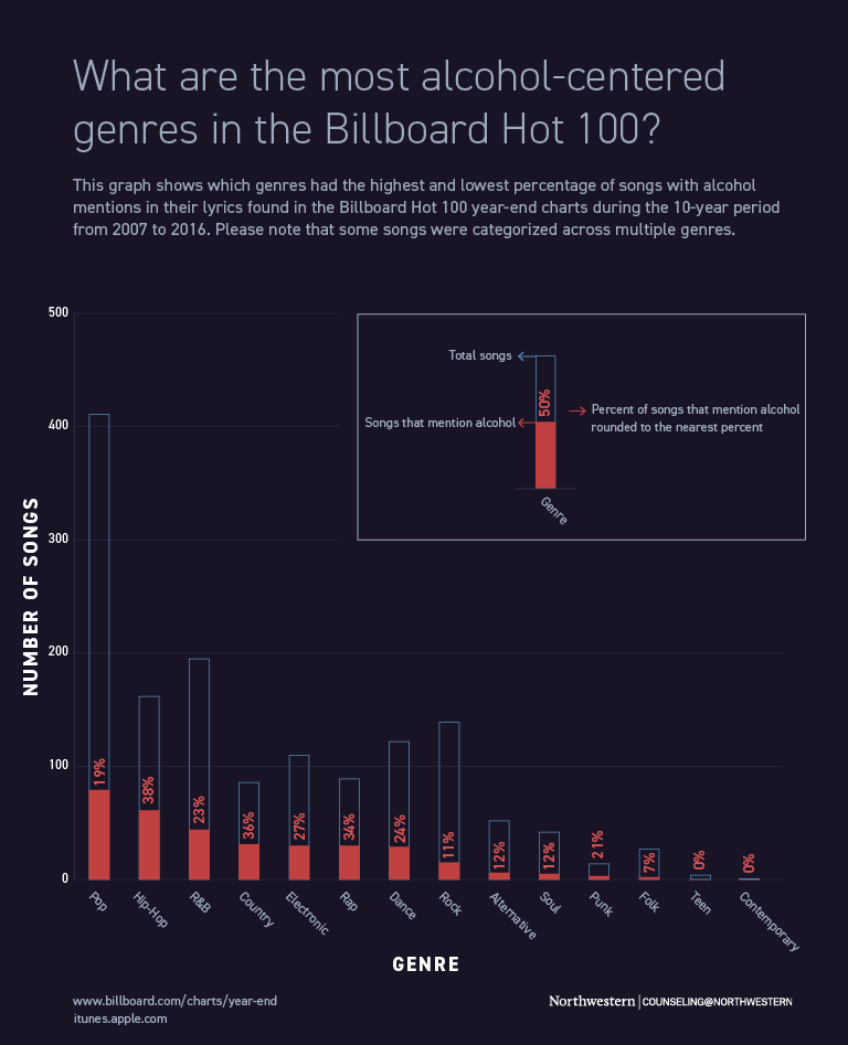The Counseling@Northwestern marketing team crunched a decade of Billboard 100 data to investigate how often popular songs mention alcohol. We began our analysis by pulling Billboard’s Hot 100 songs year-end charts from 2007 to 2016 and looking at how often the lyrics of the songs mentioned alcohol-related keywords. The keywords we searched for included top alcohol brands, terms meaning types of alcohol, and terms that mean being under the influence of alcohol. For example, some of the most popular terms found in these lyrics included “Patrón,” “champagne,” and “drunk,” but the most popular term overall was “drink.” We then analyzed that keyword data by artist and genre, which we pulled from iTunes.
