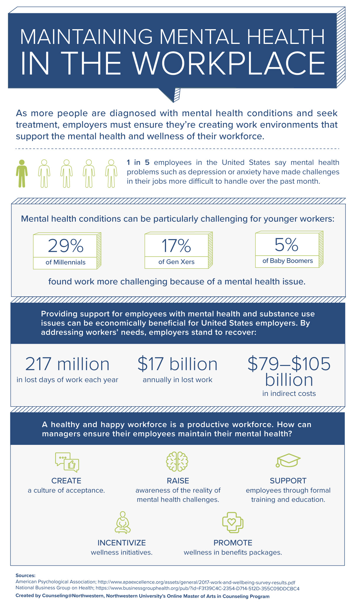 Mental illness is costly to employers. According to the National Business Group on Health, mental illness causes more days of work loss and work impairment than many other chronic conditions such as diabetes, asthma, and arthritis. Approximately 217 million days of work are lost annually due to productivity decline related to mental illness and substance-use disorders, costing U.S. employers $17 billion.